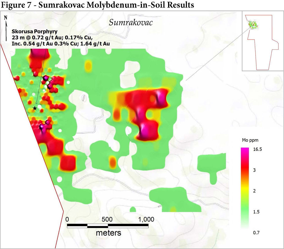 Soil surveys confirmed a Copper-Gold-Molybdenum geochemical anomaly related to the outcropping porphyry mineralisation and delineated a 700 m by 400 m copper-gold anomalous area which needs to be followed up by trenching and drilling. The molybdenum anomaly covers an area of 1500 m by 600 m and is open to the north. The soil survey also highlighted additional anomalous centers to the east of Skorusa porphyry which will require further in-fill sampling and trenching (Figure 5 - Sumrakovac Copper-in-Soil Results, Figure 6 - Sumrakovac Gold-in-Soil Results, Figure 7 - Sumrakovac Molybdenum-in-Soil Results).